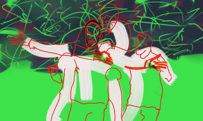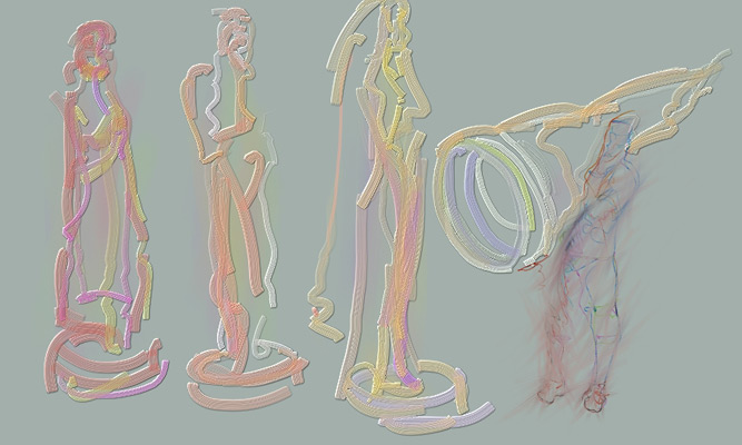 Die Kopie durch Digitale Malerei bedeutet einen völlig anderen Malprozess. Die täglich neue Vorlage provoziert eine Darstellungserfindung mit den technisch kühlen Mitteln eines Stil-Baukastens.